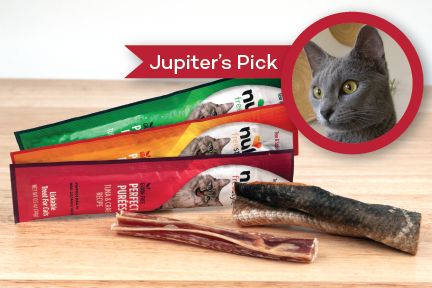 Enrich your cat’s snack times too. Salmon skin, steer sticks and tendons are small and easy to chew. To make them even more enticing, coat or stuff your cat’s favorite chew with their preferred wet or dry food!